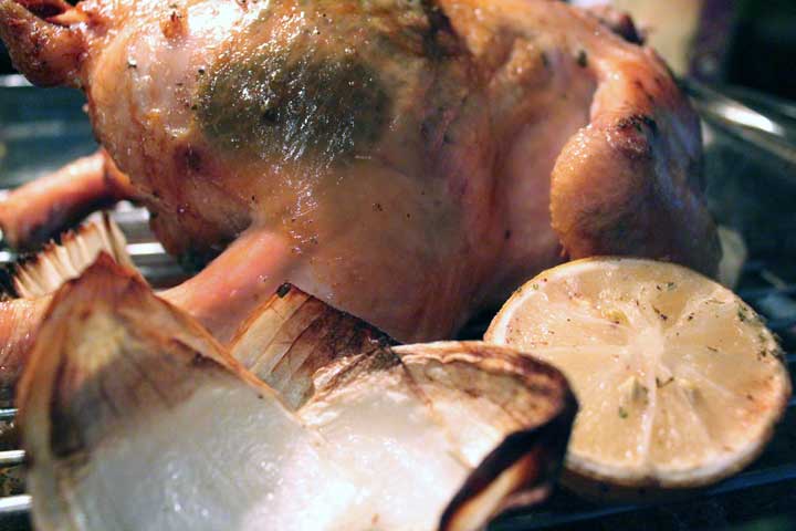 Mix the seasonings and butter together. Roll the lemon on the counter, using your hand and a little bit of pressure, until it feels slightly squishy. Cut the lemon in half and squeeze the juice inside the chicken cavity. Rub some of the butter mixture inside the cavity. Carefully loosen the skin on the outside of the chicken, using your fingers to create pockets around the breast and thighs, then rub the rest of the butter mixture under the skin. Rub the outside of the chicken, ridding your fingers of any leftover butter mixture.