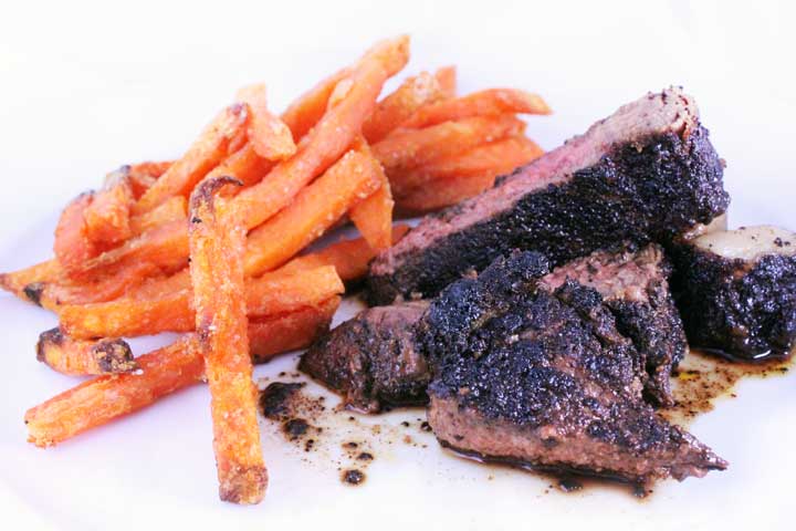 Serve with sweet potato fries that have been cooked just long enough to brown at the ends, creating a caramel crisp edge.