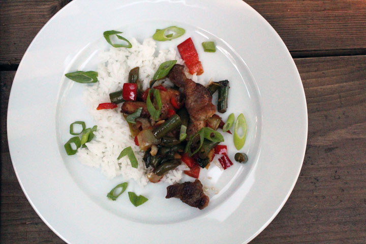 Wraps are always good for containing a great deal of vegetable goodness in an easy-to-eat format. To turn our veggie consumption up to 11, I made a side of green bean fries to go with it. We paired dinner with a Pinot Noir. There was just enough fruit in the wine to be a nice companion to the roasted red bell pepper and tomato, plus the lovely mineral characteristics were great with the mushroom.